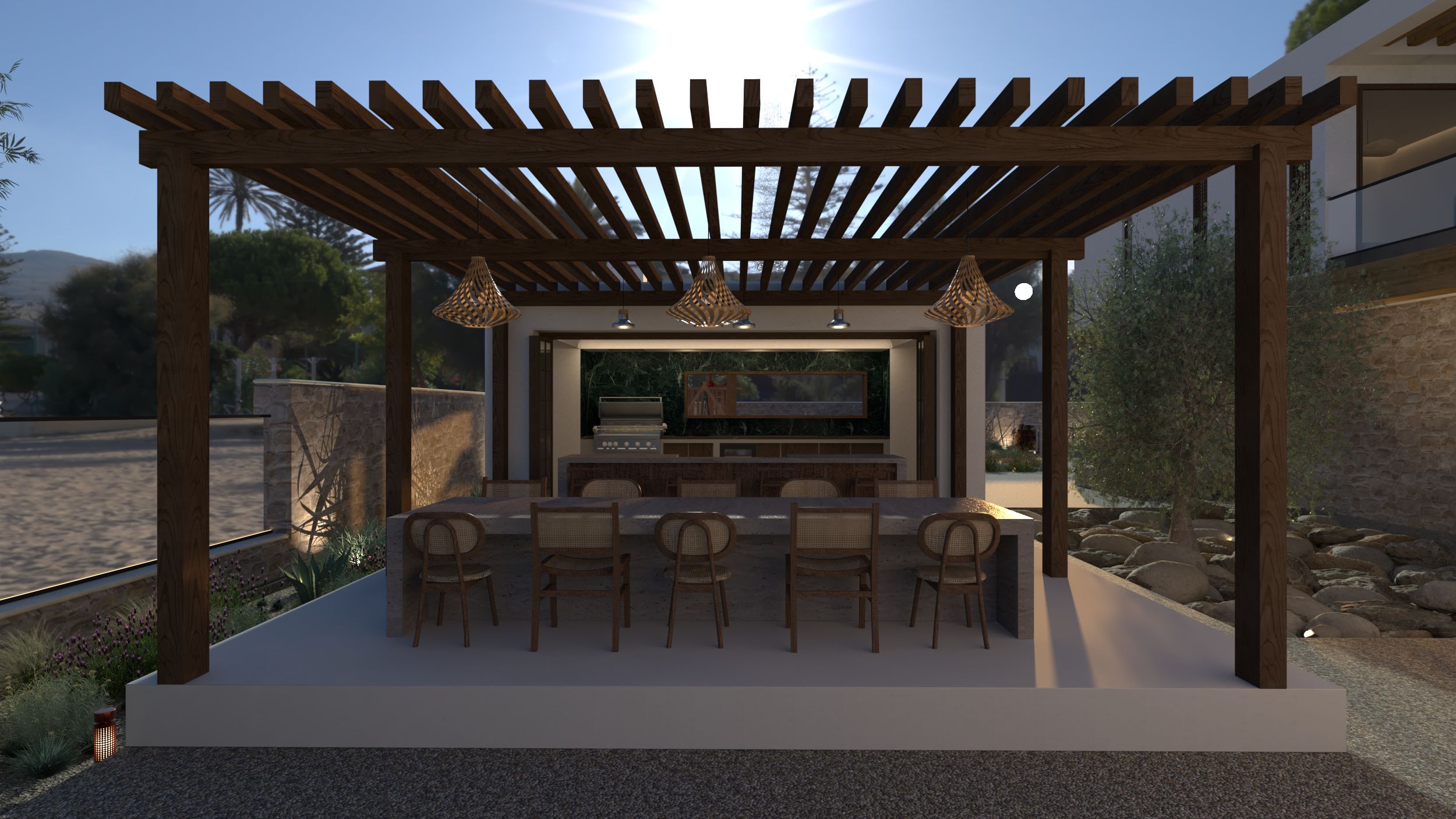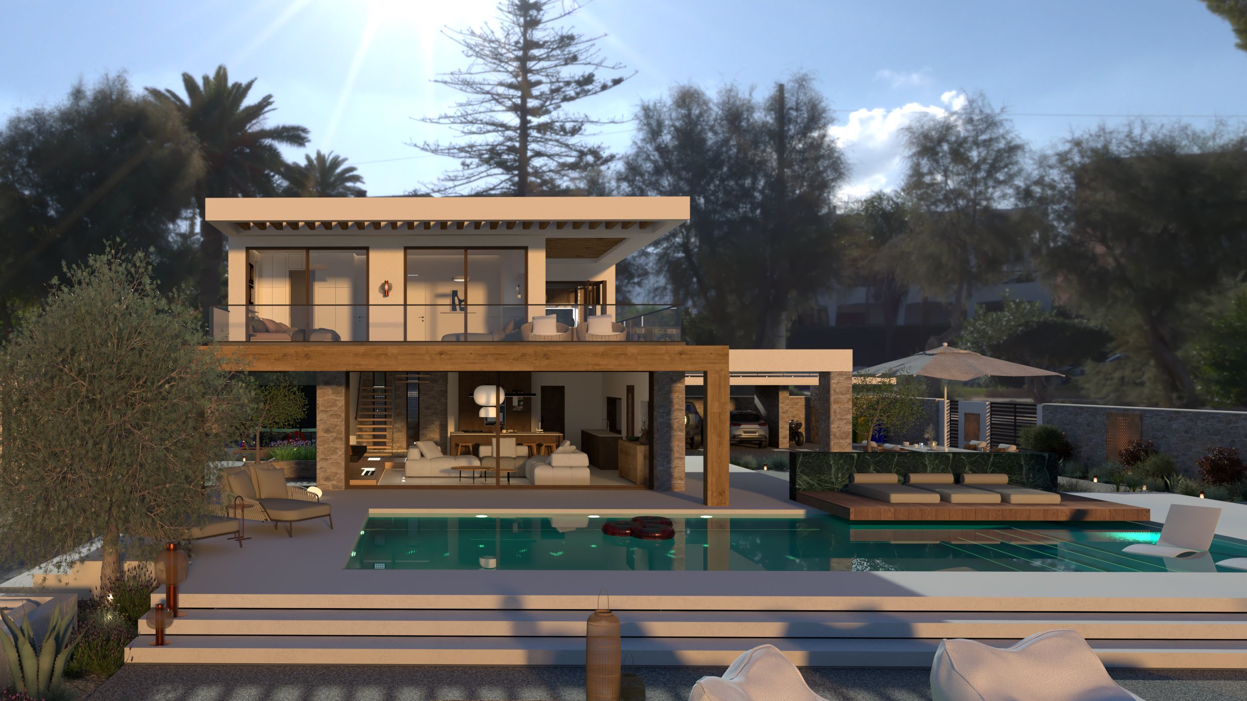 Η πέτρα, το ξύλο και οι απαλές αποχρώσεις της άμμου κυριαρχούν στο εσωτερικό, ενώ το φυσικό φως “γλιστρά” απαλά στους χώρους, δημιουργώντας εναλλαγές ζεστασιάς και σιωπής.