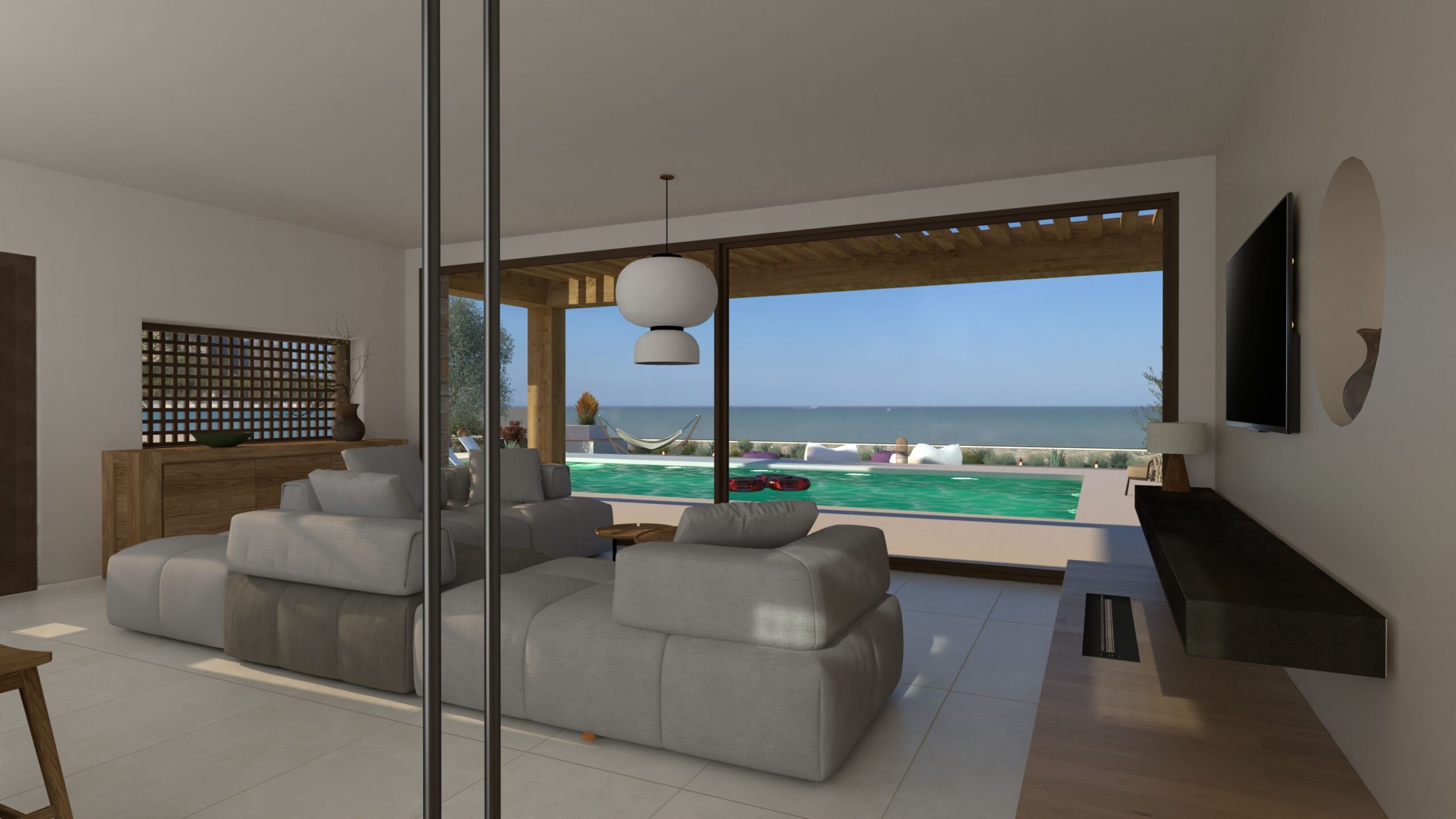 Κάθε δωμάτιο ανοίγεται προς το τοπίο, προσφέροντας την αίσθηση ότι το μέσα και το έξω αποτελούν μια ενιαία εμπειρία.